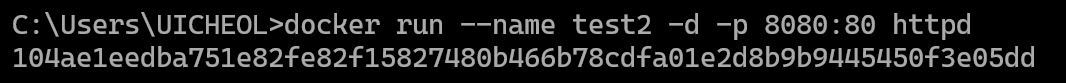 2.아파치 웹서버(httpd)를 8080:80으로 포트포워딩을 지정하 'test2' 이름으로 컨테이너를 생성해 실행한다.