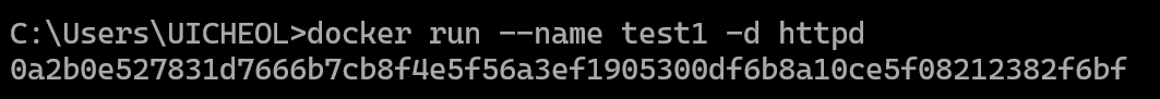 // 예시: 아파치 웹서버(httpd) 이미지를 사용해 'test1'이라는 이름의 컨테이너를 생성하고 실행