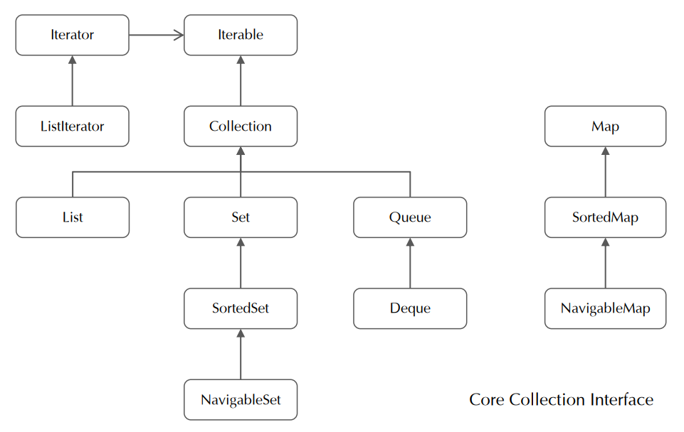 - Map 계열: 키(Key)와 값(Value)의 쌍으로 저장하고, Collection 인터페이스를 상속받지 않는 별도 계열이다. (e.g. `HashMap`, `LinkedHashMap`, `TreeMap`)