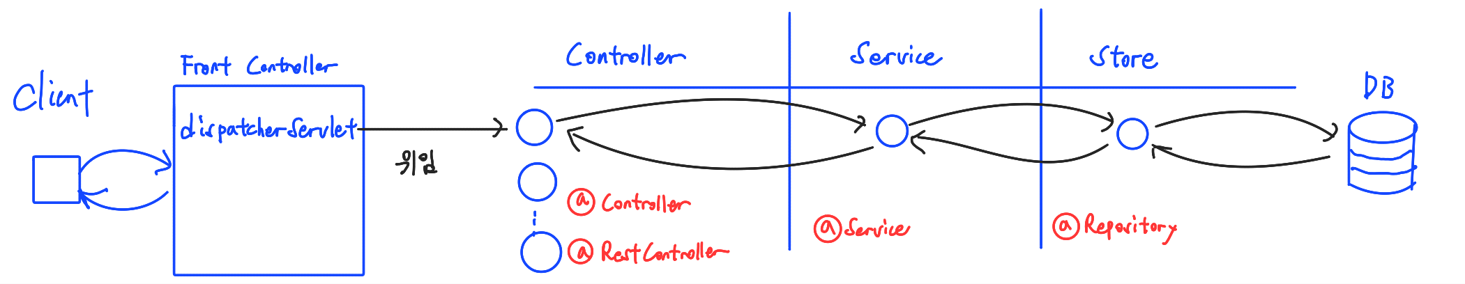 자바 코드에서는 이런 구조를 갖게된다. 클라이언트의 요청을 먼저 Front Controller인 DispatcherServlet이 전부 받아낸다. 이후 요청의 URL을 어떤 컨트롤러가 처리해야하는지 HandlerMapping에 물어봐서 해당 요청을 처리할 수 있는 우리가 구현한 개별 컨테이너에 전달한다. 컨트롤러는 서비스, 스토어 레이어를 통해 데이터를 생성, 조회, 수정, 삭제하는 처리과정을 거친다. 이러한 흐름을 통해 사용자의 요청에 대해 응답을 하게된다.