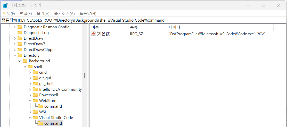- 기본값의 값데이터를 "VSCode 설치 경로" "%V" 입력
