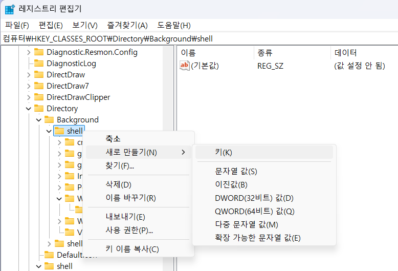 3-1. HKEY_CLASSES_ROOT\Directory\Background\shell 에 키 추가