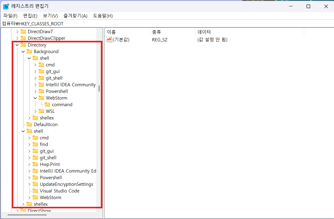 처음에 폴더가 좀 많은데 맨 위로 올라가면 HKEY_CLASSES_ROOT가 있다. 여기서 Directory를 찾아서 아래 두개 폴더를 찾아야한다.